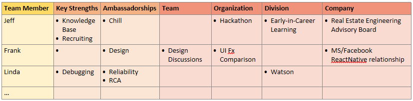 With this table on my whiteboard, as I had 1:1s with my 8 leads and skip 1:1s with the 40 developers that reported to those leads, I would ask for their additions to this table. I would create a row for them and we would fill in the columns accordingly. “I organize all of the team’s lunch and learns.” “I am passionate about design.” They were also welcome to call out additions to make to the other rows. “Linda is our Watson contact for the division.”