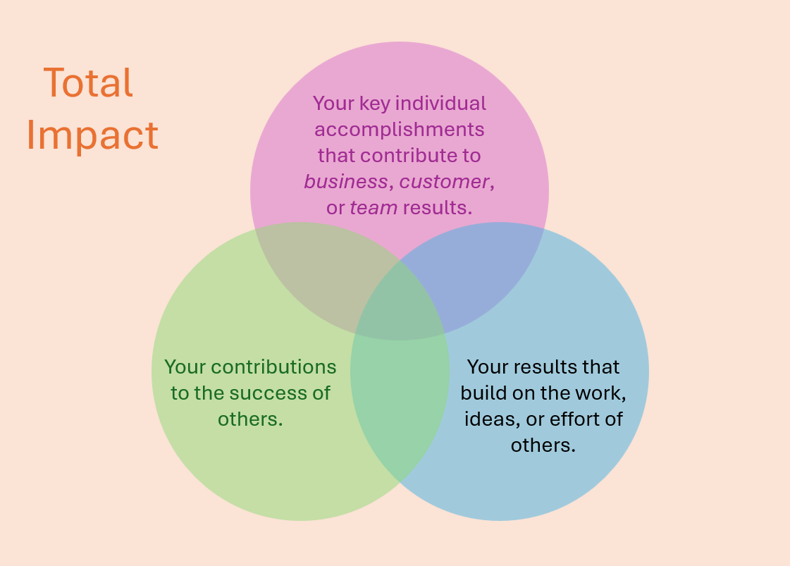 This Venn diagram can be found at the top of every Microsoft evaluation form (called “Connects”) since 2014. (aside: I take partial credit for it still being featured in Connects because I was a reviewer for HR’s revamping of this Connect form in 2023, and my first piece of feedback was, “woah, you forgot the Impact Venn diagram.” HR corrected that and the diagram lives on.)