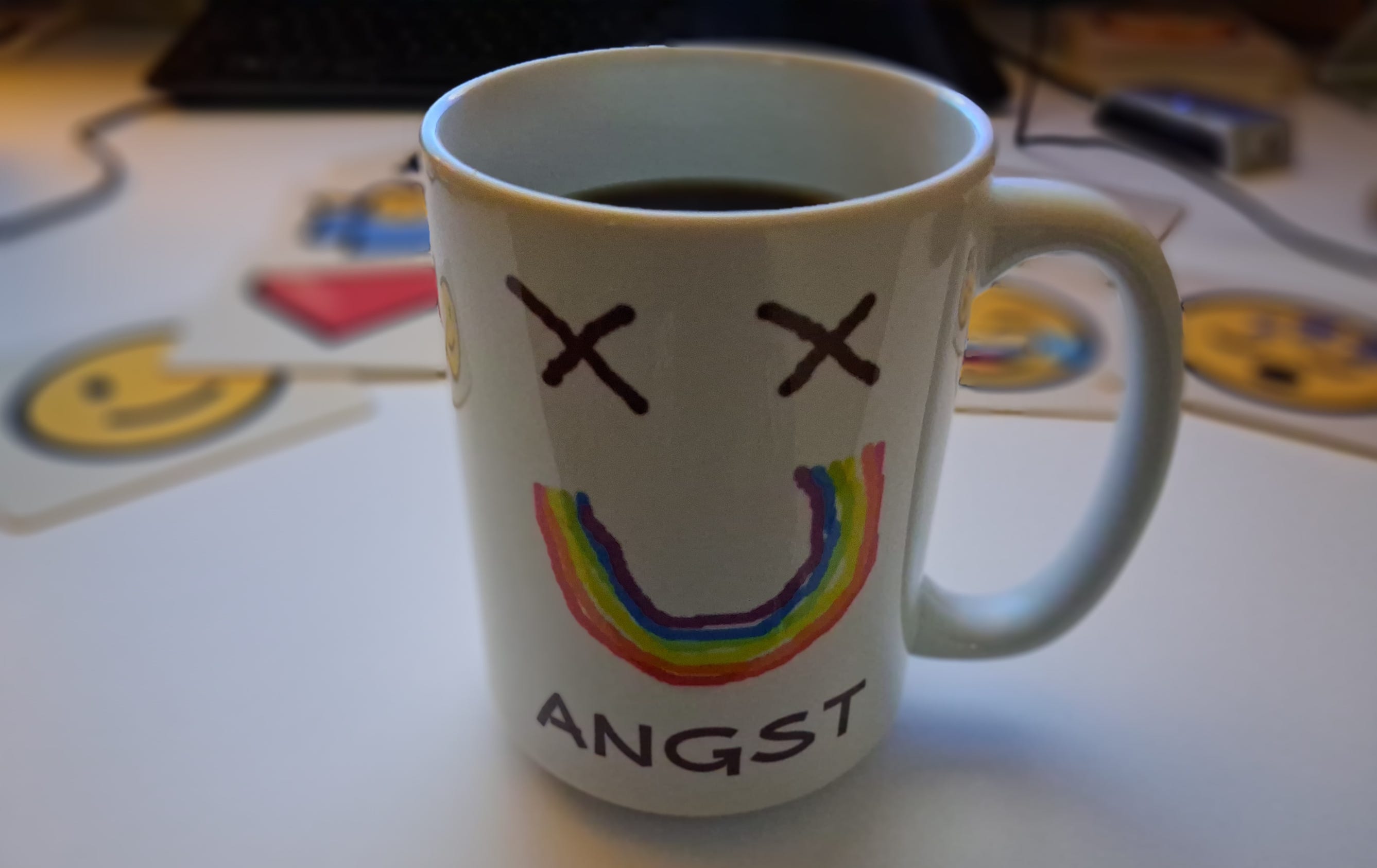My Angst Mug is my embracing of the angst. It has a rainbow on the mug, and a smile, so of course it’s a happy mug. And yet there is the angst of a naturally occurring rainbow being a frown. 🙂